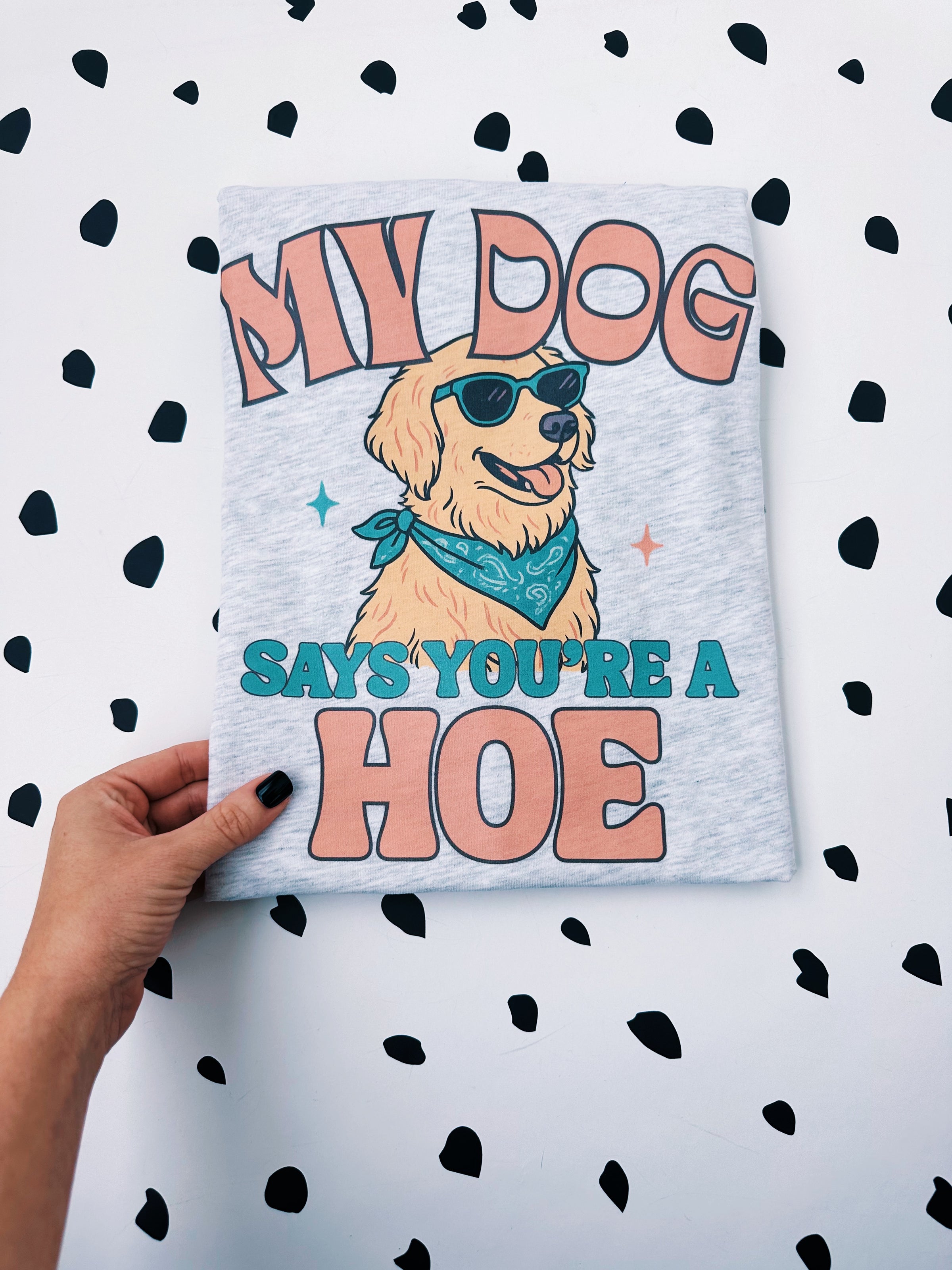 Our "My Dog Says You're A Hoe," design featured on our your choice of garment with a full color digital print!