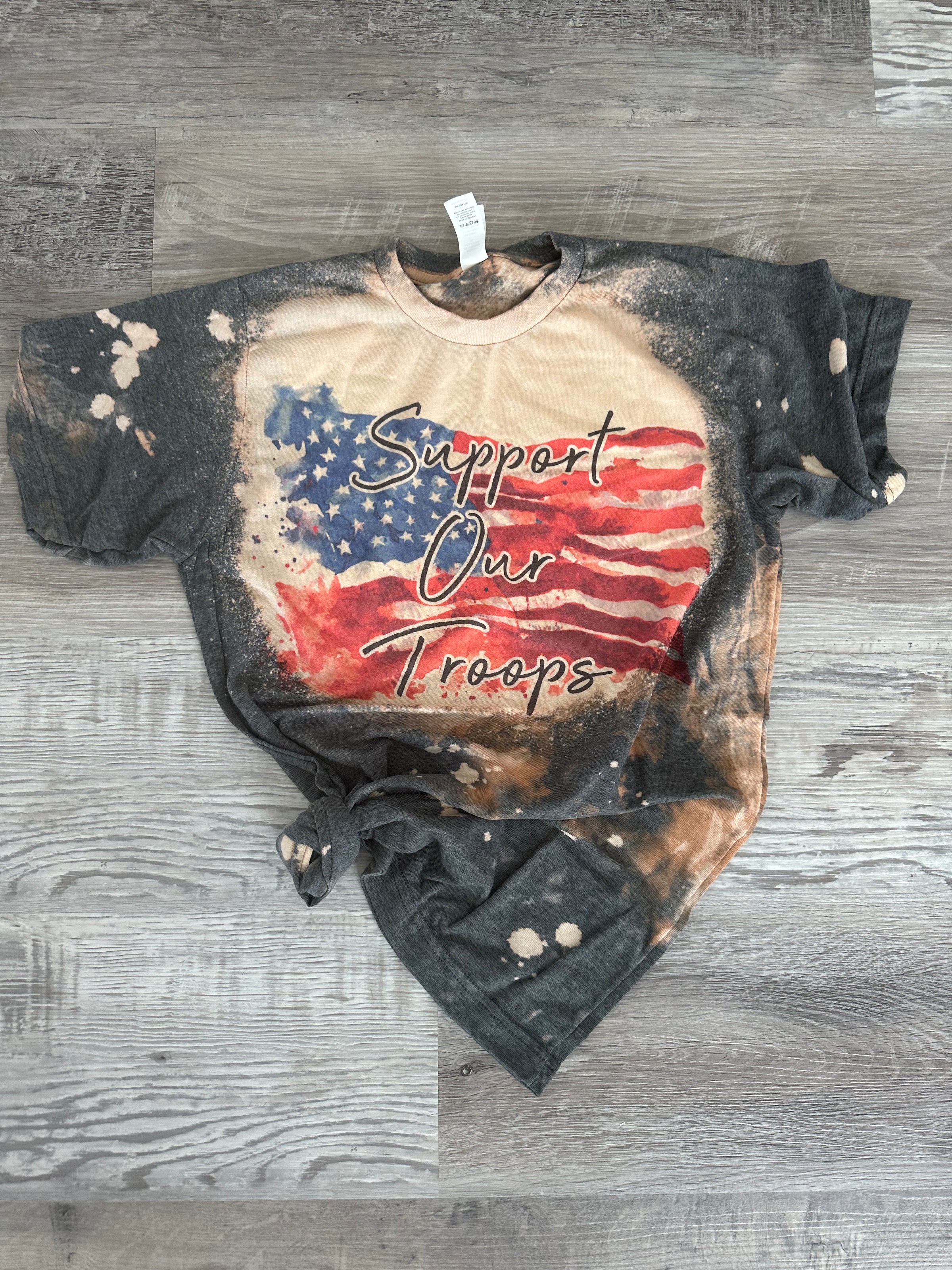 "Support Our Troops," design featured on a hand-bleached unisex tee with sublimated imagery!